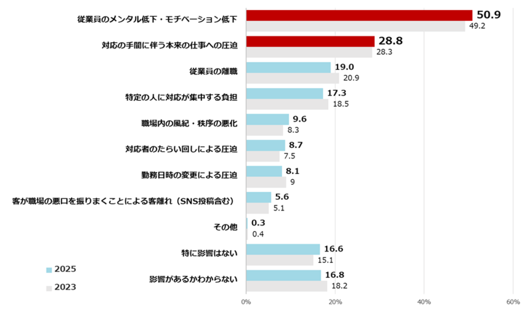 不当要求やカスハラが与える影響については、前回調査と同様「従業員のメンタル低下・モチベーション低下」が最も多く(50.9%)、次いで「対応の手間に伴う本来の仕事への圧迫」であった(28.8%)。