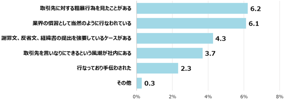 同僚や上司のカスハラ加害を見聞きしたことがある回答者は、見聞きした内容について「取引先に対する粗暴行為を見たことがある」(6.2%)、「業界の慣習として当然のように行われている」(6.1%)を選択した。