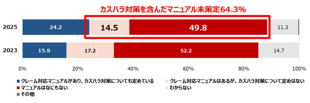 2026年改正施行予定の労働施策総合推進法では、企業によるカスハラ防止対策が義務化される。しかし、マニュアル策定について、マニュアルが何もないとの回答が49.8%、カスハラ対策について定めがないマニュアルを策定済みとの回答が14.5%であり、合計約6割(64.3%)がカスハラ対応まで含んだマニュアルを策定していない。