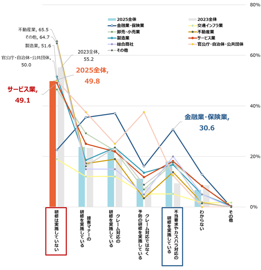 クレームやカスハラの研修は約半数で未実施 - カスハラ対策の課題意識はほぼ全ての項目で増加。