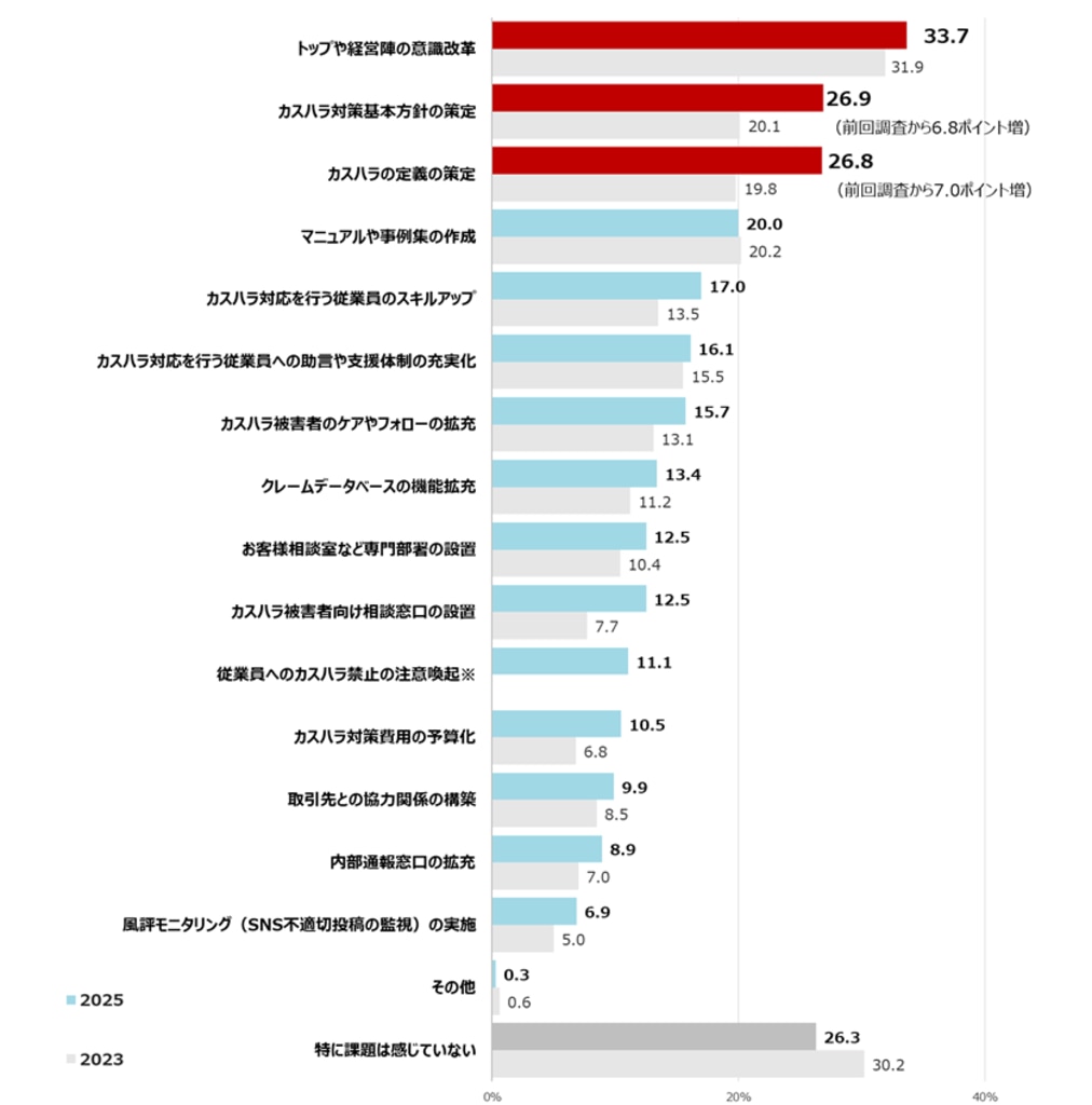 - ・6.カスハラ対策の課題意識はほぼ全ての項目で増加。経営層の意識改革が約3割と最多だが、方針や定義策定を求める声も増加